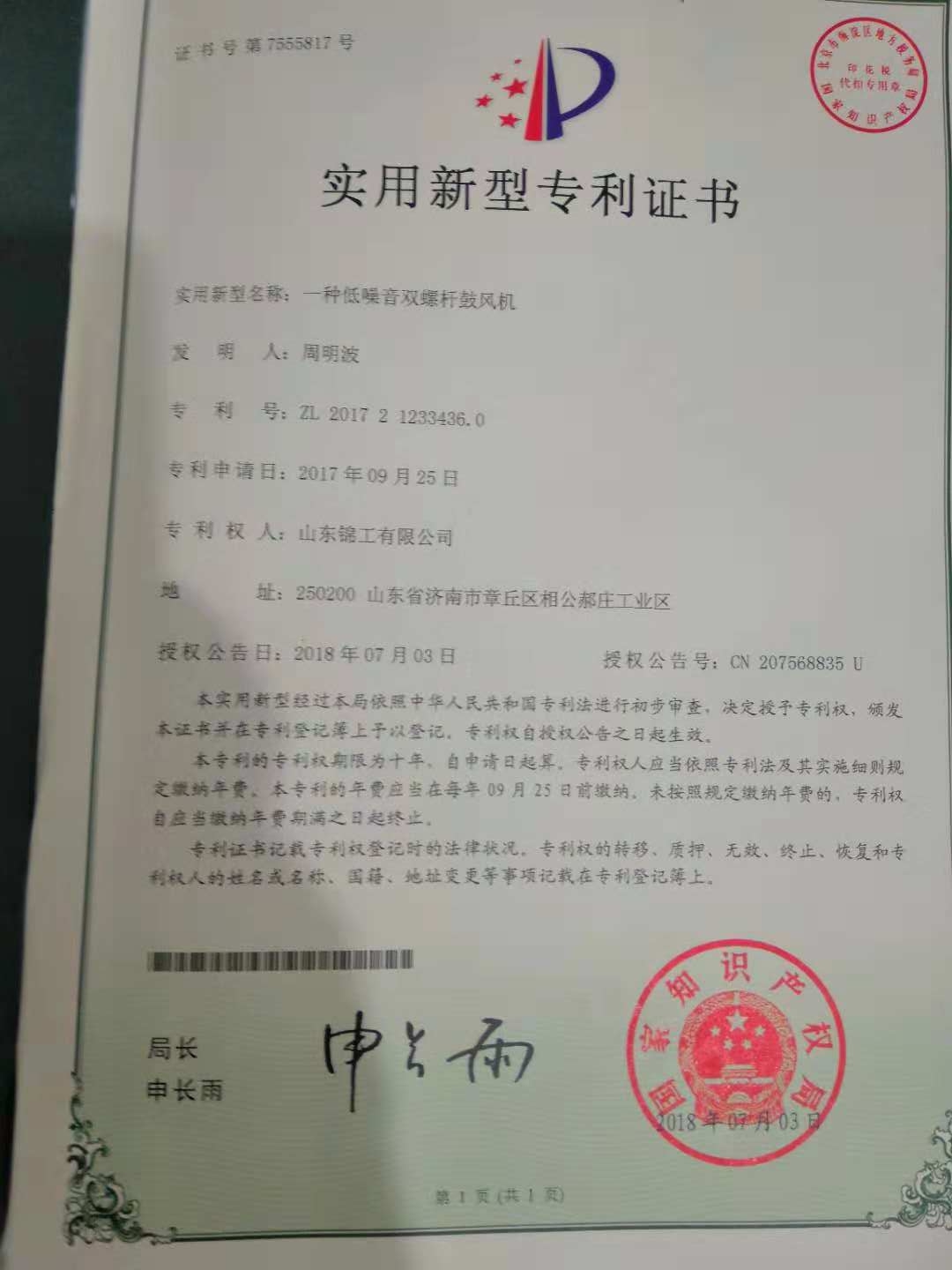 日前,錦工風機的“一種雙螺桿鼓風機” 、“一種緊湊型羅茨鼓風機” 、 “羅茨風機選型軟件” 等獲國家知識產(chǎn)權局頒發(fā)的專利及軟著證書。